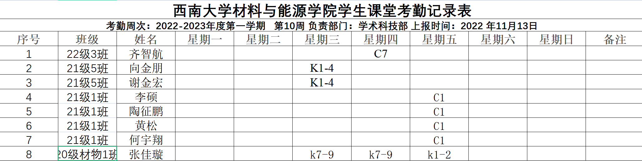 2022-2023年度第一学期材料与能源学院第十周考勤表