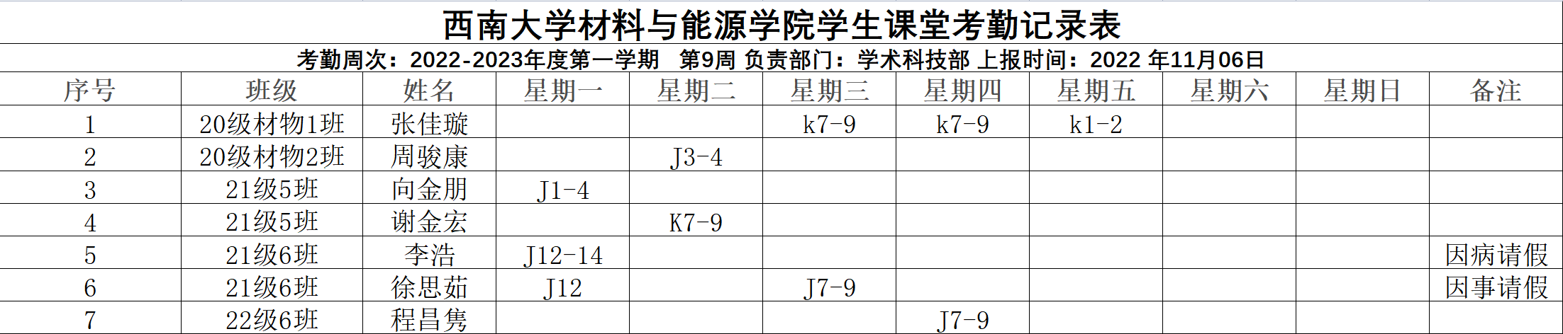 2022-2023年度第一学期材料与能源学院第九周考勤表